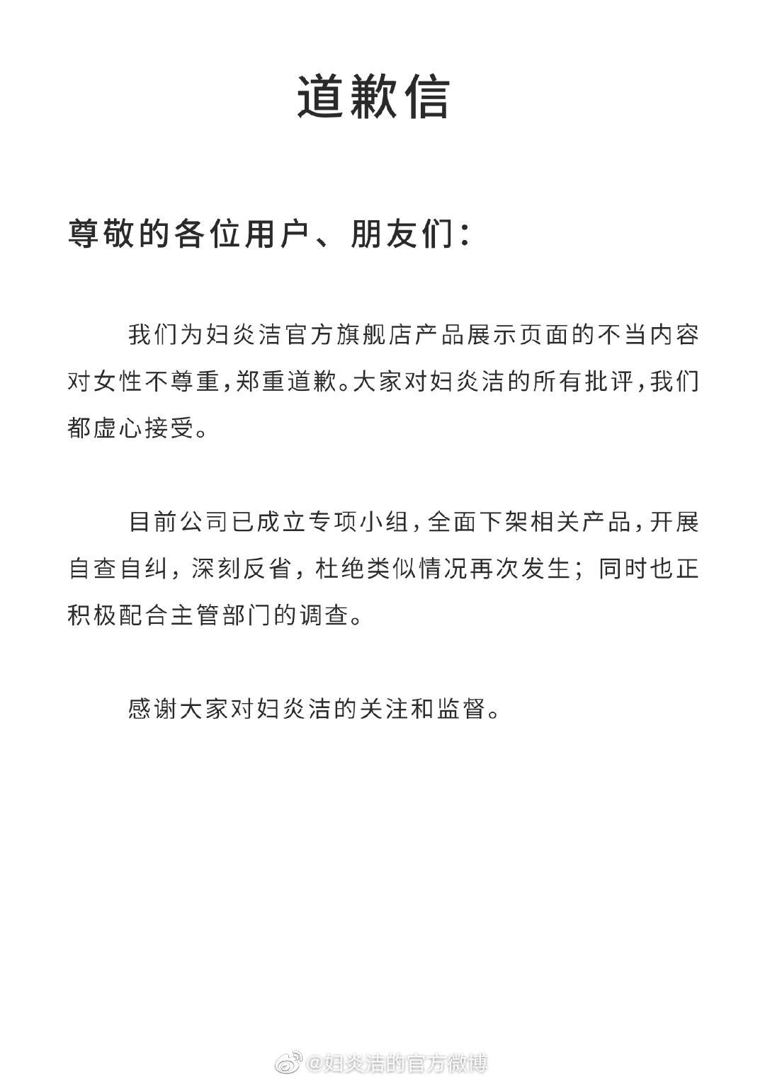 我们为妇炎洁官方旗舰店产品展示页面的不当内容对女性不尊重,郑重道歉。大家对妇炎洁的所有批评,我们都虚心接受。