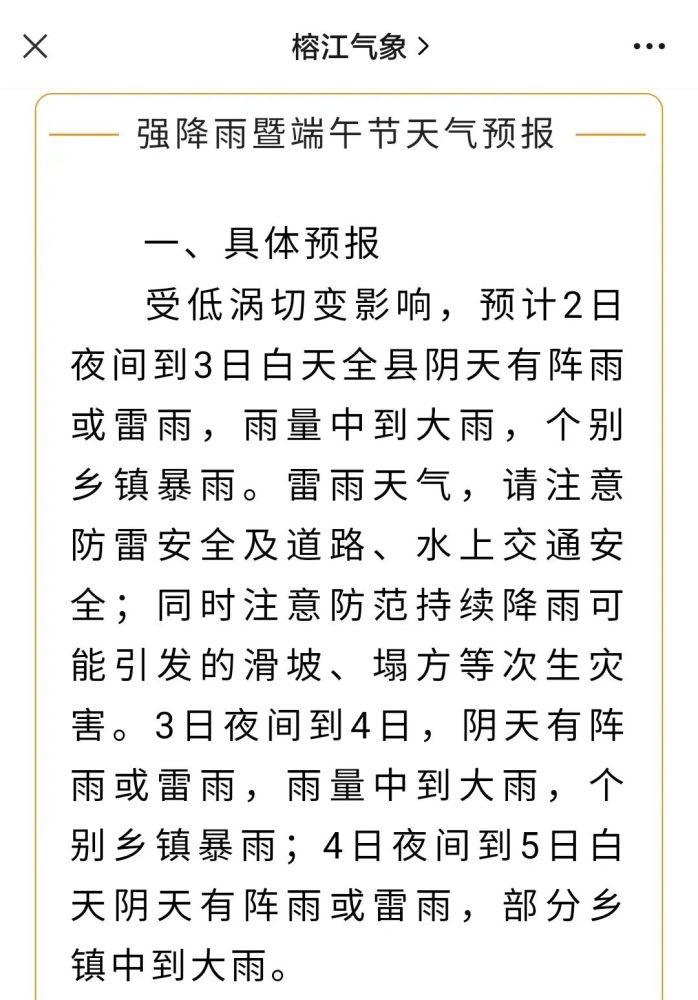 此外,榕江县气象局官方微信号“榕江气象”6月2日曾发布“强降雨暨端午节天气预报”消息。