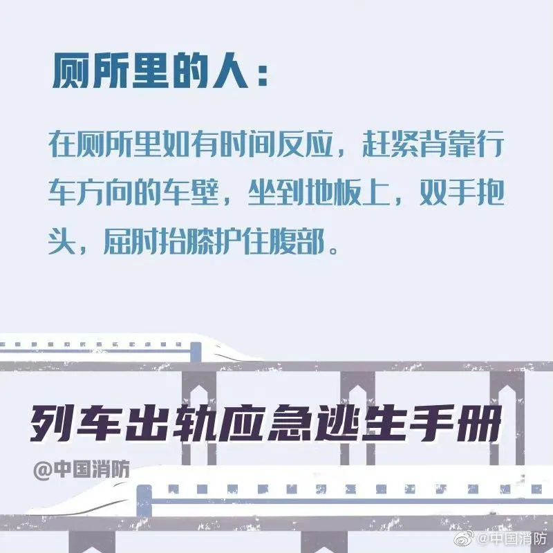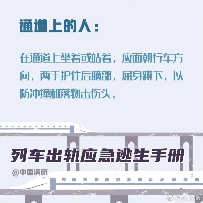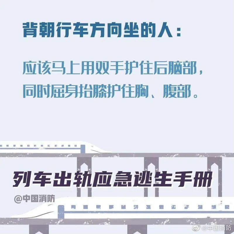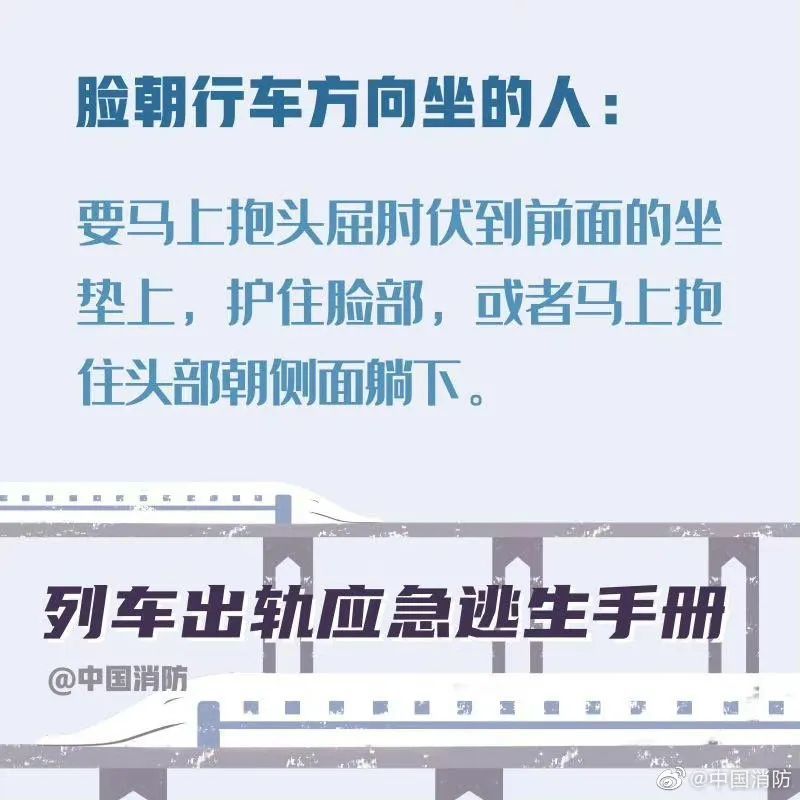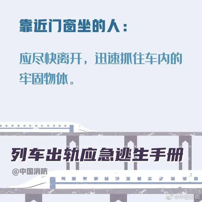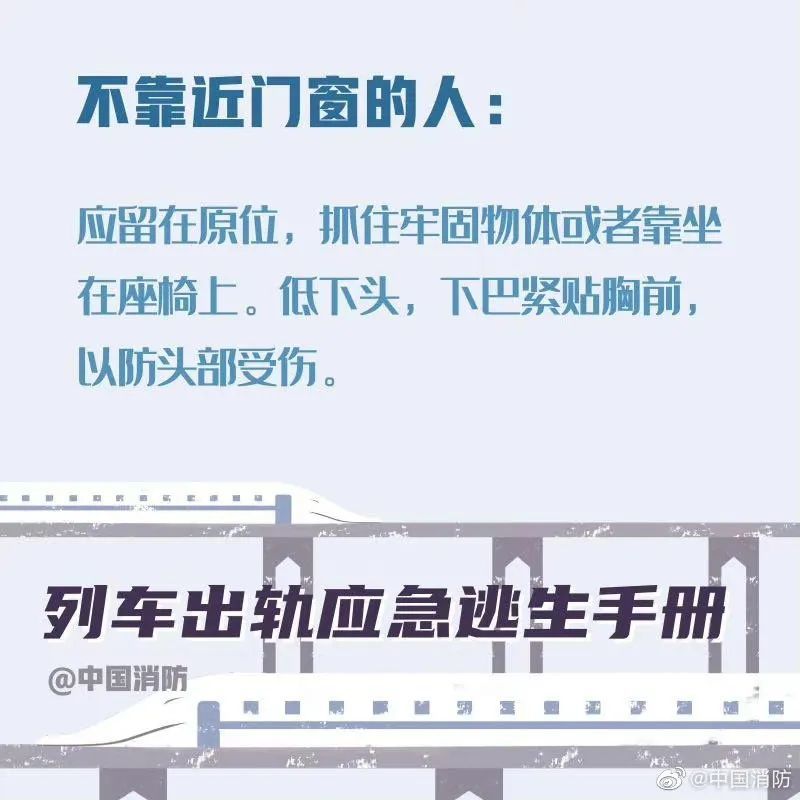 据中国消防今日微博,当列车发生事故时,乘客要尽可能保持冷静。首先记住,列车出轨的征兆是紧急的刹车、剧烈的晃动。以下这些正确的自救方式一定要记住。希望你用不到,但你一定得知道!