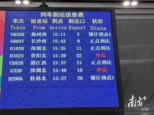 广州南开D1874、D2834、D1878、D2818、D1868、D1826、D1870、D212、D1872、D2830、D1752、D2844、D2838、D1834、D2840、D2842次停运,广州开D2877、D1857次停运,深圳北开G2922、G2930、G320次停运,泸州开D5112次停运,贵阳北开D2879、D213、D2837、D2841、D2819、D2825次停运,重庆西开D1797、D1871、D2831、D1877次,成都东开D1753、D1761、D1821、D1763、D1825、D1833、D1765、C6005次停运,广元开D1851次停运;万州北开D1881次停运,六盘水开D2848次停运,昆明南开G2928次停运,北海开D1798次停运。
