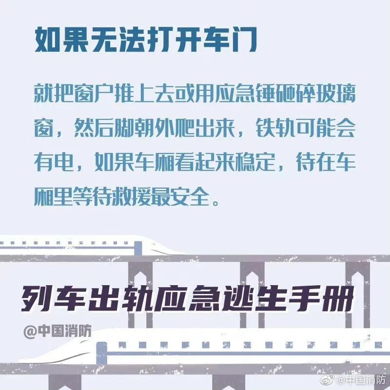 应急管理部消防救援局提醒,当列车发生事故时,乘客要尽可能保持冷静。首先记住,列车出轨的征兆是紧急的刹车、剧烈的晃动。