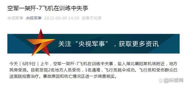 今天(6月9日)上午,空军一架歼-7飞机在训练中失事,坠入湖北襄阳某机场附近,地方民房受损。目前发现2名地方人员受伤,1名遇难,飞行员跳伞成功。飞行员和受伤群众已送医院检查治疗。事故原因和伤亡情况正进一步调查核实。