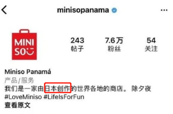 在此事受到广泛讨论后,又有网友在社交平台曝出,名创优品在巴拿马地区的社交媒体账号上的介绍中,公然标明自己是日本创立的品牌。
