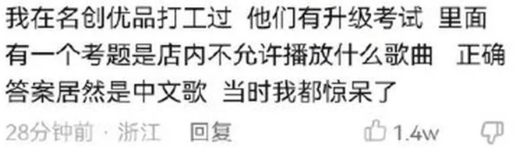 除此之外,一位自称在名创优品打过工的网友表示,名创优品店内不允许播放中文歌。还有网友称,有人到名创优品直播间点播中文歌被禁言。