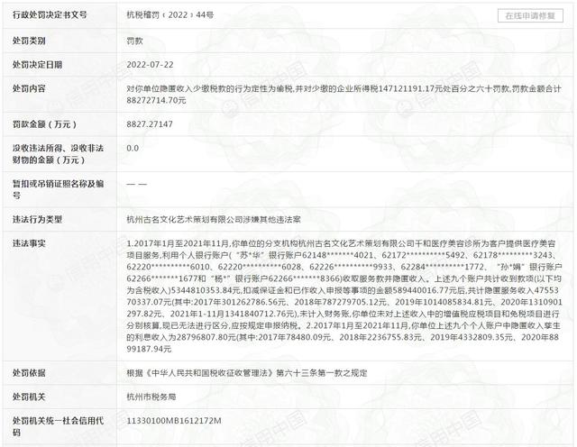 查询信用中国网站,行政处罚决定书文号为杭税稽罚﹝2022﹞44号,处罚内容为:对隐匿收入少缴税款的行为定性为偷税,并对少缴的企业所得税147121191.17元处百分之六十罚款,罚款金额合计88272714.70元,处罚决定日期为2022年7月22日。