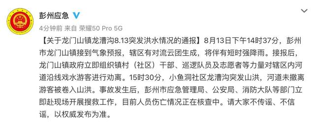 8月13日下午14时37分,彭州市龙门山镇接到气象预报,辖区有对流云团生成,将伴有短时强降雨。接报后,龙门山镇政府立即组织镇村(社区)干部、巡逻队员及志愿者等力量对辖区内河道沿线戏水游客进行劝离。15时30分,小鱼洞社区龙漕沟突发山洪,河道未撤离游客被卷入山洪。事故发生后,彭州市应急管理局、公安局、消防大队等部门立即赴现场开展搜救工作,目前人员伤亡情况正在核查中。请大家不传谣、不信谣,以权威发布为准。