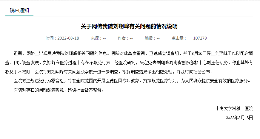 8月18日,湘雅二医院针对网友举报发布情况说明称,初步调查发现,该院医生刘翔峰在医疗过程中存在不规范行为,决定免去刘翔峰湖南省创伤急救中心副主任职务,停止其处方权及手术权限。医院将对刘翔峰有关问题线索展开进一步调查,根据调查结果做出相应处理,并及时向社会公布。