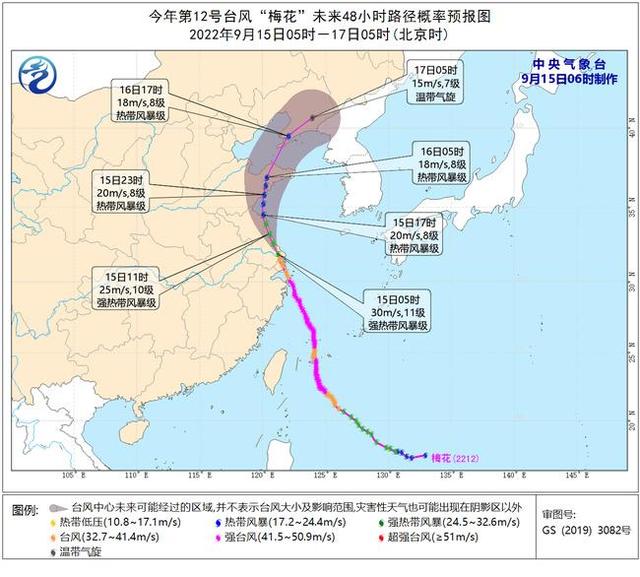 预计,“梅花”将以每小时25-30公里的速度向北偏西方向移动,今天白天自南向北穿过江苏东部沿海,将于今天傍晚前后从江苏盐城附近移入黄海南部海面,并将于今天夜间在山东半岛南部沿海再次登陆(热带风暴级,20-23米/秒,8-9级),以后逐渐转向北偏东方向,穿过山东半岛后,将于16日白天移入渤海海峡,并逐渐变性为温带气旋。