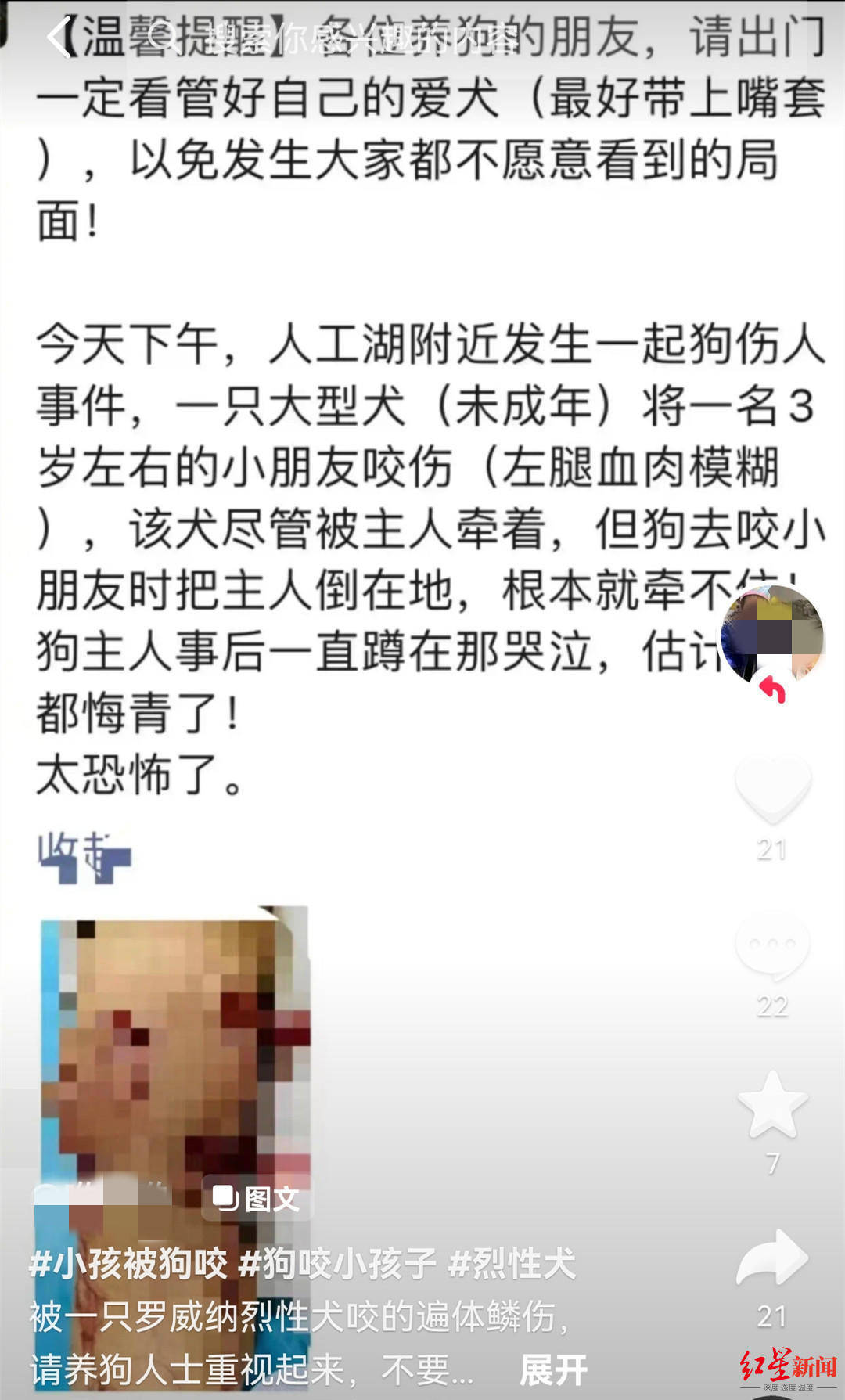 这两天,孩子的父母在社交平台发布了一则“温馨提醒”:各位养狗的朋友,请出门一定看管好自己的爱犬(最好戴上嘴套),以免发生大家都不愿意看到的局面!