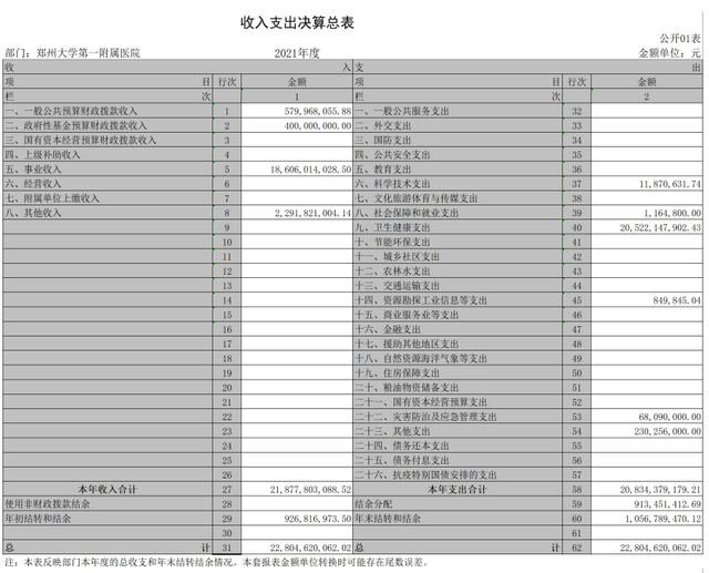 近日,有“亚洲最大医院”之称的郑州大学第一附属医院(下简称郑大一附院)在官网公布了其2021年度单位决算数据。报表显示,郑大一附院2021年收入合计218.78亿元,合计支出为208.34亿元,与上年度相比,收、支总计增长13.04%;年初结转和结余为9.27亿元,年末结转和结余10.56亿元。