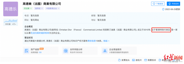 值得注意的是,天眼查显示,高德乐曾用名为“Christian Dior (France) Commericial Limited 克丽斯汀迪奥(法国)商业有限公司”。无论是曾用名还是现用名,高德乐均在名字里面加上了法国字样,但该公司的注册地在中国香港,并非法国。