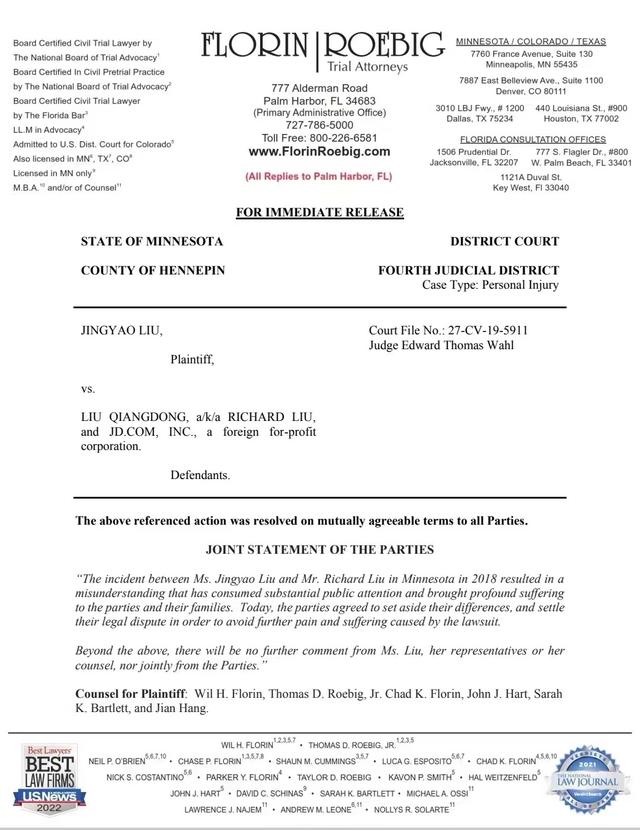 声明称:刘强东先生和刘婧尧女士于2018年在美国明尼苏达的一次偶然事件所造成的误会,占用了大量的社会资源,也给彼此的家庭造成了深重的困扰。今天,为了避免进一步的诉讼伤害,双方决定消除误会,达成和解,为这次事件画上句号。除以上声明,刘婧尧女士及其代表和律师不再发表任何评论,双方也不会出具其它的联合声明。