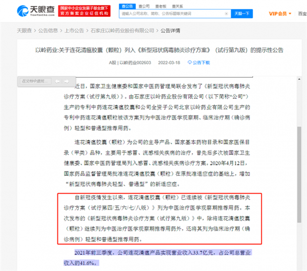 3月18日,以岭药业发布《关于连花清瘟胶囊(颗粒)列入(试行第九版)的提示性公告》,称连花清瘟胶囊(颗粒)除了继续列为中医治疗医学观察期推荐用药外,还被列为临床治疗期(确诊病例)轻型和普通型推荐用药。