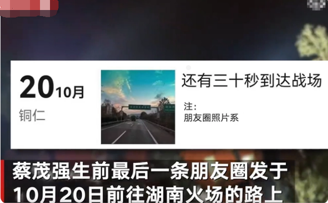 蔡茂强生前最后一条朋友圈是:还有30秒到达战场。这个朋友圈是发于10月20日前往湖南火场的路上。年纪轻轻地就牺牲了,实在是令人惋惜!他的好友称,蔡茂强已经有了女朋友,计划好了明年就结婚,还曾邀请好友帮忙看婚房。