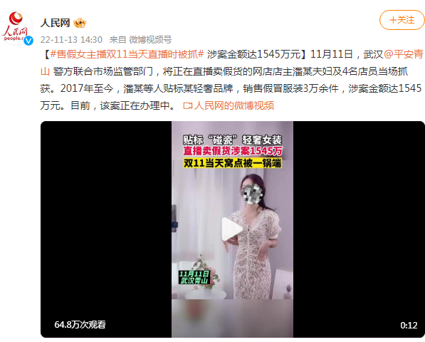 11月11日,武汉@平安青山 警方联合市场监管部门,将正在直播卖假货的网店店主潘某夫妇及4名店员当场抓获。2017年至今,潘某等人贴标某轻奢品牌,销售假冒服装3万余件,涉案金额达1545万元。目前,该案正在办理中。