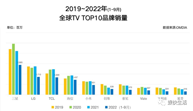 全球数据提供商Omdia发布的数据则显示,2022年前三季度全球电视销量/销售额排名,三星电子以20.2%位居榜首,之后依次是LG电子(12%)、TCL(11.7%)、海信(10.1%)、小米(6.5%);从销售额维度看,三星电子市场份额为30.2%,稳居第一;LG电子市场份额为17%,排名第二;TCL市场份额为9.3%,排名第三;海信市场份额为8.6%,排名第四;索尼市场份额为8%,排名第五。