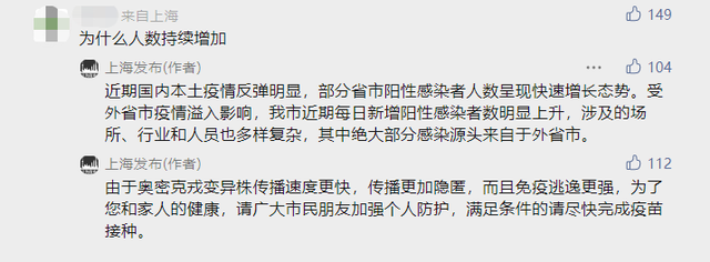 截图来自微信公号“上海发布”上海发布回应:近期国内本土疫情反弹明显,部分省市阳性感染者人数呈现快速增长态势。受外省市疫情溢入影响,我市近期每日新增阳性感染者数明显上升,涉及的场所、行业和人员也多样复杂,其中绝大部分感染源头来自于外省市。有网友问:排查情况如何?