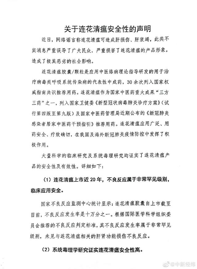 原标题:以岭药业发声明:多方面均证实连花清瘟有良好的安全性