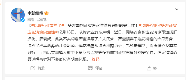 12月18日,以岭药业发布声明,近日,网络谣言称连花清瘟可造成肝损伤、肝衰竭,此类不实消息严重误导了广大民众,严重损害了连花清瘟的产品形象,造成了极其恶劣的社会影响。连花清瘟从组方用药历史、系统毒理学、临床研究及荟萃分析、上市后大规模人群中不良反应监测等多方面均证实有良好的安全性。连花清瘟药品说明书针对不良反应有明确体现。