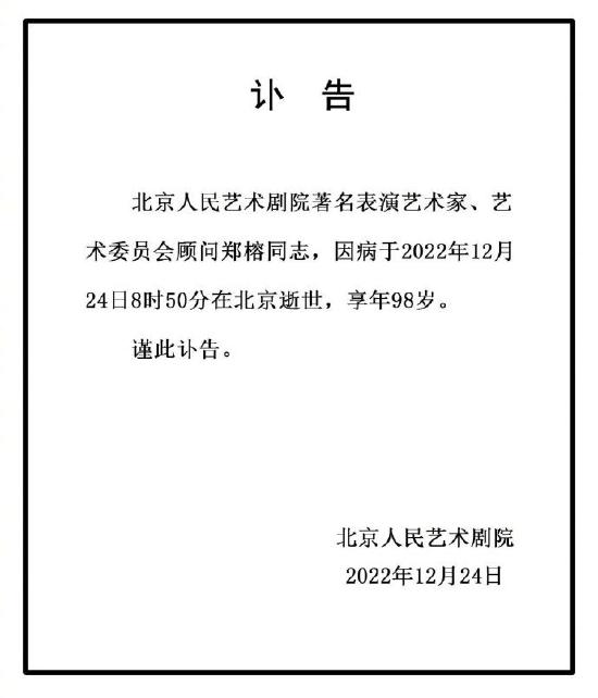 新浪娱乐讯 24日,北京人民艺术剧院发布讣告,著名表演艺术家郑榕去世,享寿98岁。郑榕参演过《雷雨》《长征》《茶馆》《智取威虎山》《武则天》等经典作品,也曾在86版《西游记》中出演太上老君,在94版《三国演义》中出演孔融。