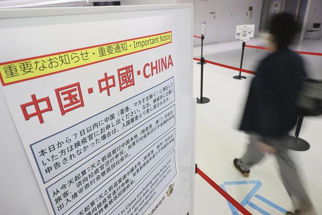 2023年1月12日,一名乘坐中国大陆直飞日本航班的旅客抵达千叶县成田机场检疫亭,通过登机口接受抗原定量检测。
