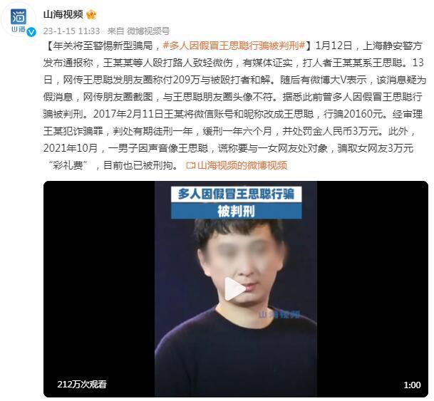 1月12日,上海静安警方发布通报称,王某某等人殴打路人致轻微伤,有媒体证实,打人者王某某系王思聪。13日,网传王思聪发朋友圈称付209万与被殴打者和解。随后有微博大V表示,该消息疑为假消息,网传朋友圈截图,与王思聪朋友圈头像不符。据悉此前曾多人因假冒王思聪行骗被判刑。2017年2月11日王某将微信账号和昵称改成王思聪,行骗20160元。经审理王某犯诈骗罪,判处有期徒刑一年,缓刑一年六个月,并处罚金人民币3万元。此外,2021年10月,一男子因声音像王思聪,谎称要与一女网友处对象,骗取女网友3万元“彩礼费”,目前也已被刑拘。