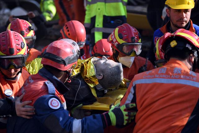 2月12日,在土耳其哈塔伊省安塔基亚市,中国救援队转移一名救出的幸存者。新华社记者 沙达提 摄