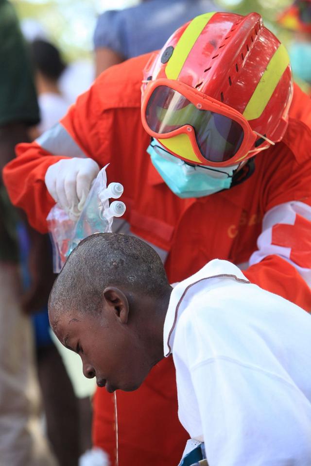 2010年1月14日,中国国际救援队的医务人员在海地首都太子港为伤员进行治疗。 2010年1月13日,海地地区发生7级以上强震,人员伤亡惨重,财产损失巨大。海地地震发生后,中国国际救援队是第一支赶到灾区并同时展开搜救和医疗救助的国际救援队。 新华社记者 邢广利 摄