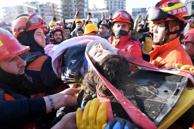 2月9日,在土耳其哈塔伊省安塔基亚市,中国救援队与土耳其救援队转移一名救出的女性幸存者。 新华社记者 沙达提 摄