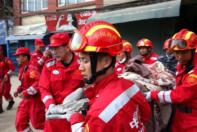 2015年4月26日,在尼泊尔首都加德满都,搜救队员从坍塌的楼房中抬出一名幸存者。中国国际救援队26日到达尼泊尔后,经过4小时艰苦搜救,在加德满都西北部发现一名幸存的20多岁男青年。新华社记者 白阳 摄
