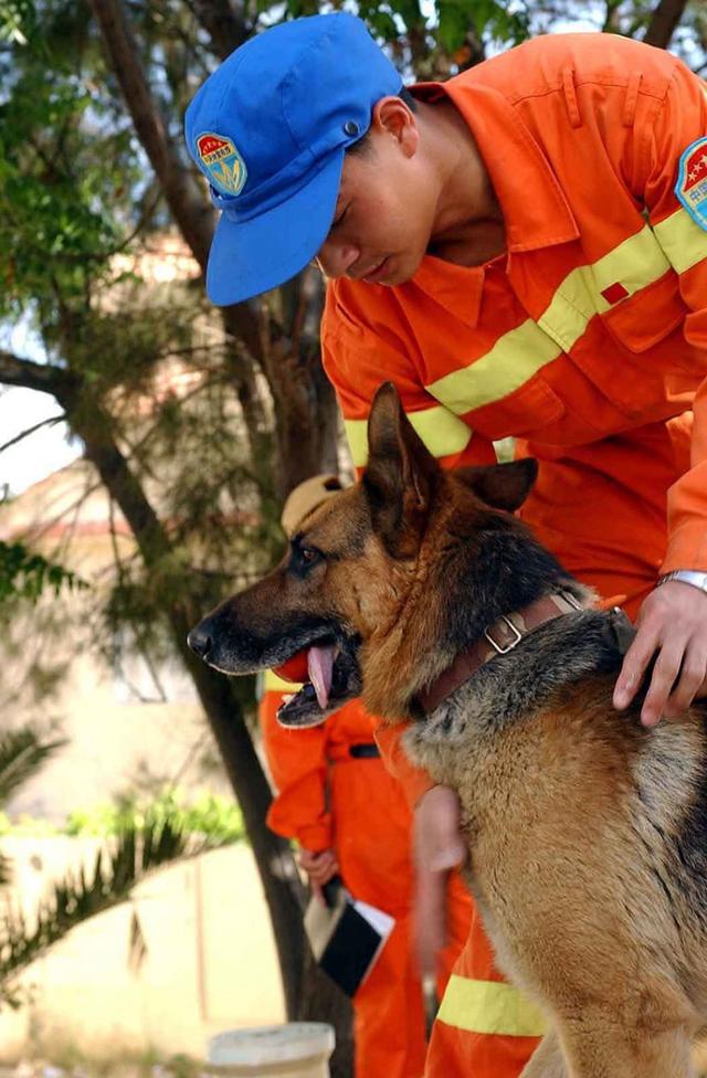 2003年5月28日,一名中国国际救援队队员与三岁的搜索犬“超强”在阿尔及利亚地震灾区德利斯参与救援工作。新华社记者 黄敬文 摄