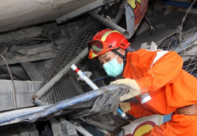 2011年2月28日,中国救援队队员在新西兰克赖斯特彻奇市的坎特伯雷电视大楼废墟中搜救。2月22日,克赖斯特彻奇发生6.3级地震,造成180多人死亡。新华社记者 李秋婵 摄