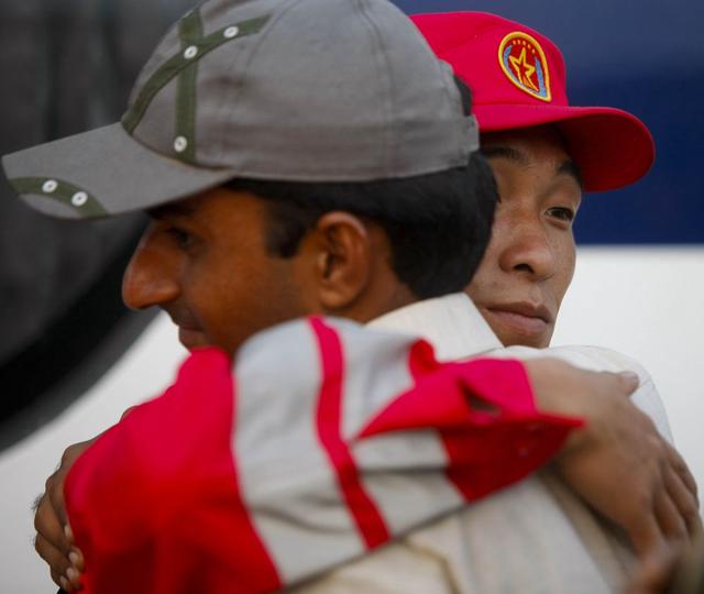 2010年9月14日,在巴基斯坦南部特达地区,准备启程回国的中国国际救援队第一批队员在驻地与巴基斯坦工作人员相拥道别。 新华社记者 周磊 摄