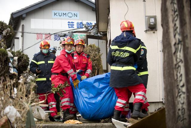 2011年3月15日,中国国际救援队队员在日本岩手县大船渡市运送遇难者遗体。2011年3月11日,一场发生在日本东北部海域的大地震震动了日本,震惊了世界。这场地震立即引发了巨大的海啸,给日本东北沿岸地区造成严重的破坏。新华社记者 吕小炜 摄