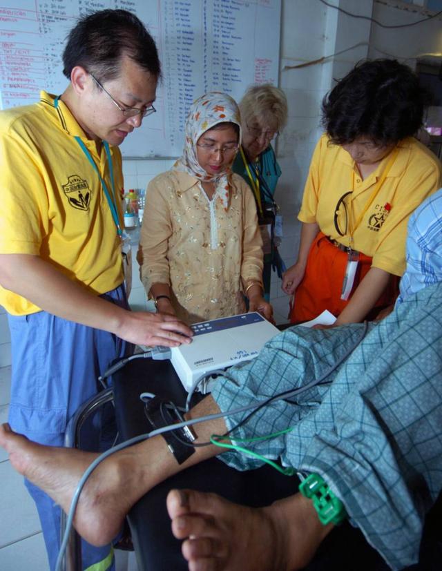2005年1月22日,在印度尼西亚海啸灾区班达亚齐总医院,中国国际救援队队员为病人诊治。 2004年12月26日,印度尼西亚苏门答腊近海发生8.7级地震,并引发大规模海啸,造成严重人员伤亡。新华社记者 王建华 摄