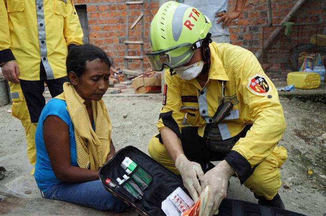 2016年4月21日,在厄瓜多尔曼塔,中国公羊救援队队员救助一位灾民。一场强烈地震4月16日撕裂了厄瓜多尔西北部沿海五省,厄瓜多尔政府宣布国家进入紧急状态。新华社发