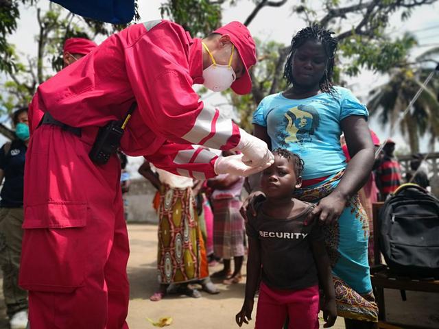 2019年3月27日,在莫桑比克贝拉市区一处灾民安置点,中国救援队医护人员为一名儿童测量体温。赴莫桑比克实施国际救援的中国救援队27日至28日在受强热带气旋“伊代”重创的莫中部索法拉省展开救助行动。新华社记者 聂祖国 摄