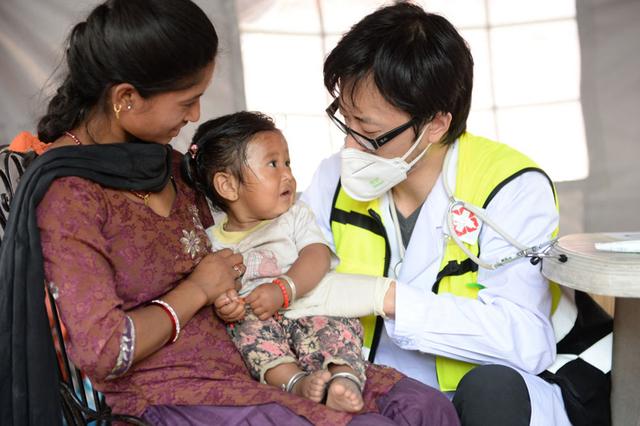 2015年5月1日,在尼泊尔巴德岗杜巴广场,来自中国明珠救援队的徐医生(右)为小朋友看病。尼泊尔发生8.1级强震,面对这场突如其来的自然和人道主义灾难,作为尼泊尔友邻的中国迅速动员起来,数十支来自中国国家、军方和民间的救援队、医疗队第一时间紧急赶赴灾区施救。新华社记者 秦晴 摄