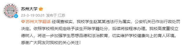 3月17日晚,网络平台出现苏州大学一学生恶意P图侮辱女性的网帖,引发舆论关注。19日凌晨,苏州大学再回应:经调查核实,该校学生赵某某违法行为属实,公安机关已作出行政处罚决定。依照学校相关规定给予该生开除学籍处分,后续将按程序办理。