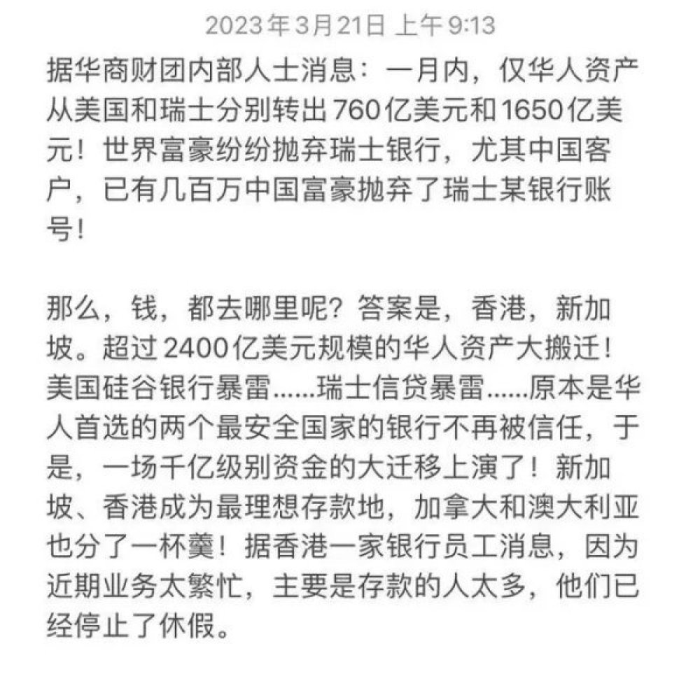 疯传的图片中描述了以下内容,“据华商财团内部人士消息,一月内仅华人资产从美国和瑞士分别转出760亿美元和1650亿美元!世界富豪纷纷抛弃瑞士银行,尤其中国客户,已有几百万中国富豪抛弃了瑞士某银行账号!超过2400亿美元规模的华人资产搬迁至香港和新加坡,加拿大和澳大利亚也分了一杯羹,据香港一家银行员工消息,因为近期业务太繁忙,主要是存款的人太多,他们已经停止了休假。”