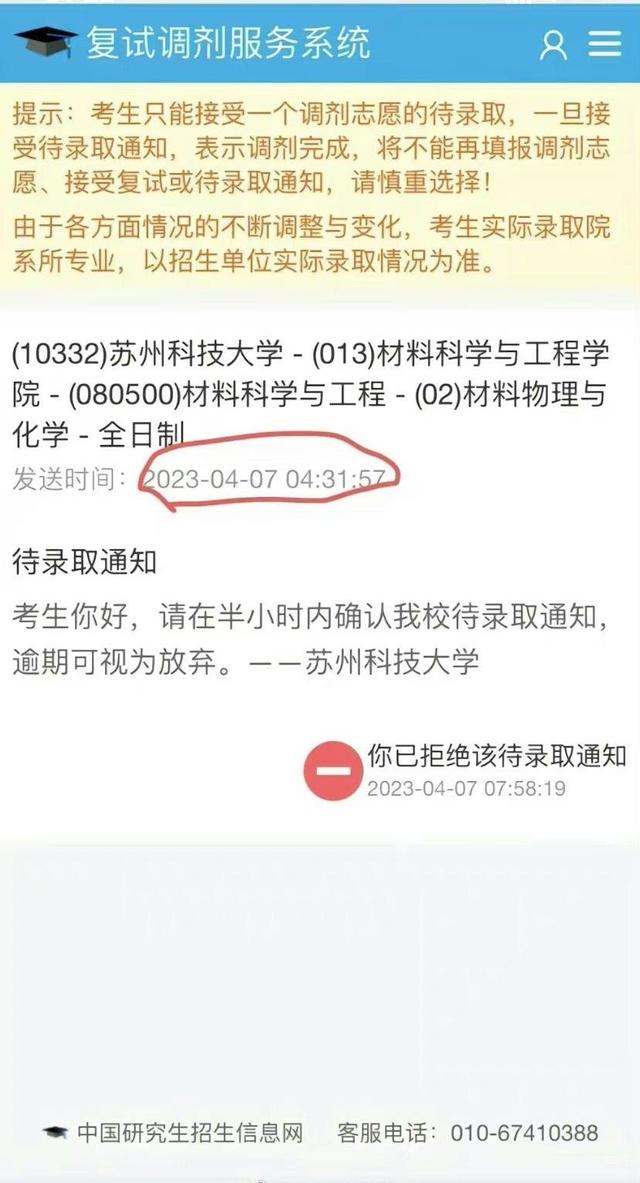 4月8日,“苏科大凌晨4点发待录取通知”引发热议,网友发布的待录取通知显示,苏州科技大学材料科学与工程学院在4月7日凌晨4点31分发布待录取通知,要求考生“在半个小时内确认我校待录取通知,逾期可视为放弃”。不少网友质疑“为什么非要在凌晨四点半?”