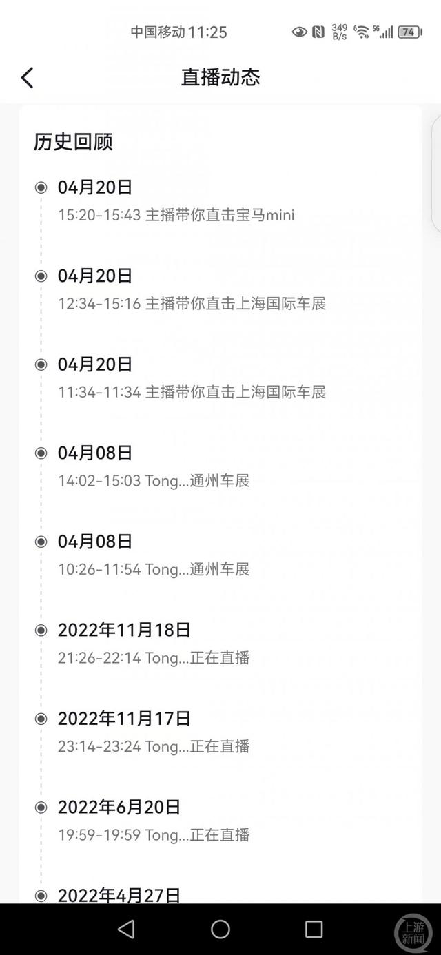 从Tongtong的抖音账号的直播记录来看,她除了4月20日在上海车展直播了3次之外,今年4月8日播过2次,剩下最近一期直播是2022年11月。