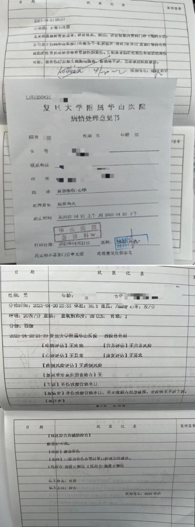 4月20日晚上10点过,Tongtong离开派出所后,又和同行朋友前往上海华山医院验伤,据她介绍:“我受到了惊吓一直心跳加速,我朋友嘴唇在被强制拖拽的过程中撞破流血,腰部被撞击疼痛,医生开具了病假条并叮嘱好好休息。”