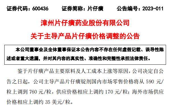 5月5日晚间,A股中药巨头片仔癀发布关于主导产品片仔癀价格调整的公告。公告显示,鉴于片仔癀产品主要原料及人工成本上涨等原因,公司决定自公告之日起,公司主导产品片仔癀锭剂国内市场零售价格将从590元/粒上调到760元/粒,供应价格相应上调约170元/粒;海外市场供应价格相应上调约35美元/粒。