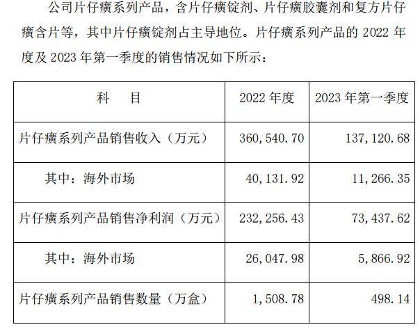 在本次的公告披露中,公司表示,片仔癀系列产品的2022年度及2023年第一季度的销售情况如下所示:
