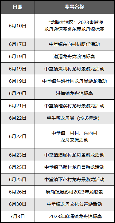 有民谣传唱:初一万江;初二西塘尾、道滘、斗朗、蕉利;初三卢村、大汾;初四牛涌尾、槎滘、滘联;初五新和、望牛墩、横坑;初六江南、潢涌、保安围、九曲、曲海(五乡)、大鱼沙;初七湛翠、洪梅;初八小河、沥江围、马沥、北丫;初九漳澎;初十温塘过端午节;十二新塘(属增城,东莞龙舟亦参加);十三中堂;十四新村;十六麻涌。