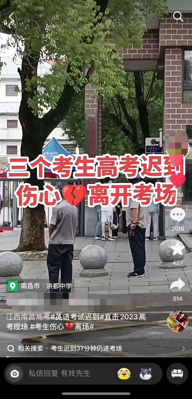 6月8日,江西南昌洪都中学高考考点一名考生迟到37分钟仍能进入考场引发关注后,又有网友曝出该考点当日下午的英语考试也有3名考生迟到,却未能进入考场。