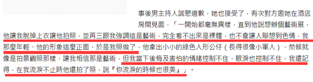 看对方不乐意,这位男主持人告知这并不是裸照而是艺术,让别人完全看不出来,由于这位男主持人的形象太过刚正,加上在圈内的名气很大,所以这位女网友就答应了他的要求,按照他说的去做了,拍完照后,这位女网友止不住流泪哭了出来,这位男主持人继续给她灌输思想,表示,你流泪的时候也很美,虽然这件事过去了这么多年,但一想到这句话她依然觉得很恶心。