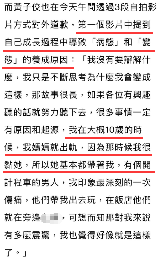 提到当时对女孩的伤害,黄子佼承认自己当时有变态的心理,同时也透露自己变成这样的原因是来自原生家庭导致,他的母亲在他10岁的时候出轨,而后在他的面前和另外的男人亲密,这件事让他极受刺激。