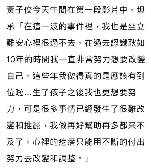 眼看事情的关注度越来越高,黄子佼本人发布了三段视频回应,他一开始没有露面,觉得太丢人了,他直言一直思考要怎么去面对这一切,首先他向当事人公开道歉,表示辜负了很多人的信任跟期待,虽然这件事过去了很长时间,但他一直坐立难安心里很过不去。